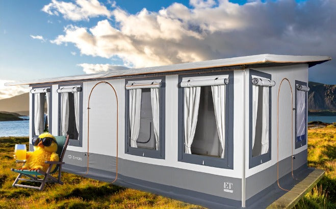 Et helårstelt for alle sesonger! Vårt frittstående helårstelt med sluse til campingvognen....
