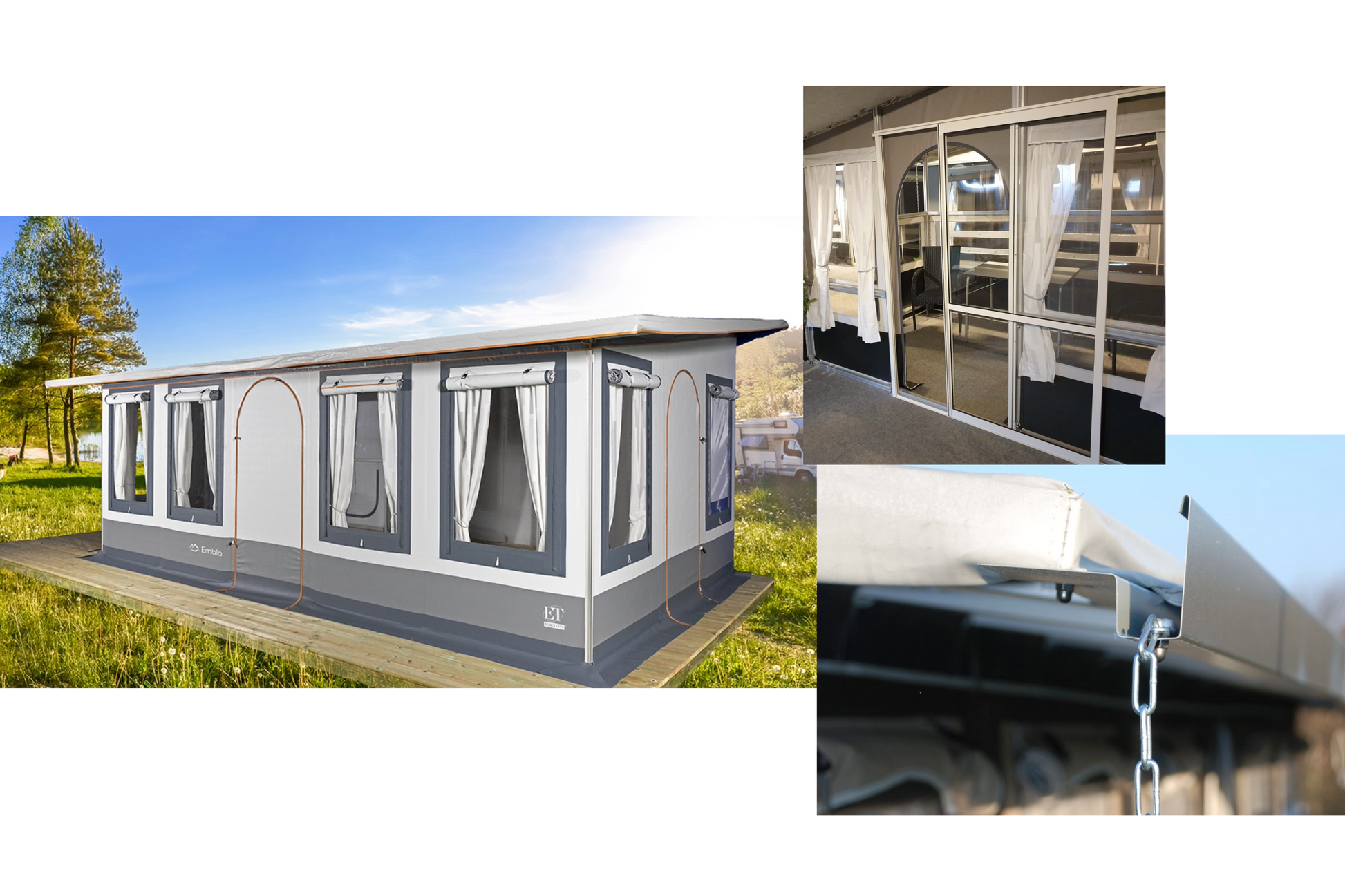Embla er fremtidens telt som tilbyr den optimale løsningen for en behagelig og enkel camping i alle årstider. Stativ i 40x40 mm aluminiumsprofiler, vindusklaffer med glidelås og innertak. Teltet har ikke sluse, med andre ord vil du få teltet helt inntil vognen. Dette vil gi vognen din et helhetlig utseende, samtidig som du får full utnytting av plassen.